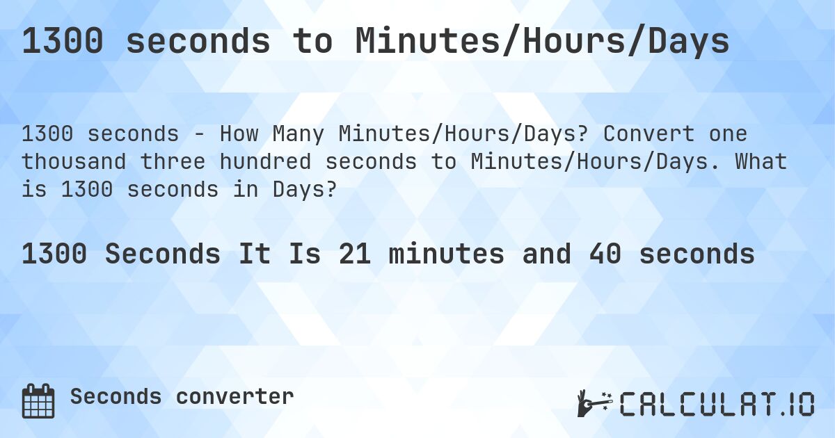 1300 hours = 54.16667 days result in plain english 1300 hours are equal to exactly 54.17 days. The calculation to convert 1300 hours to days is as follows : 1,300 hours is equal to about 54.2 days. In scientific notation 1300 hours = 1.3e+3 hours = 5.4e+1 days